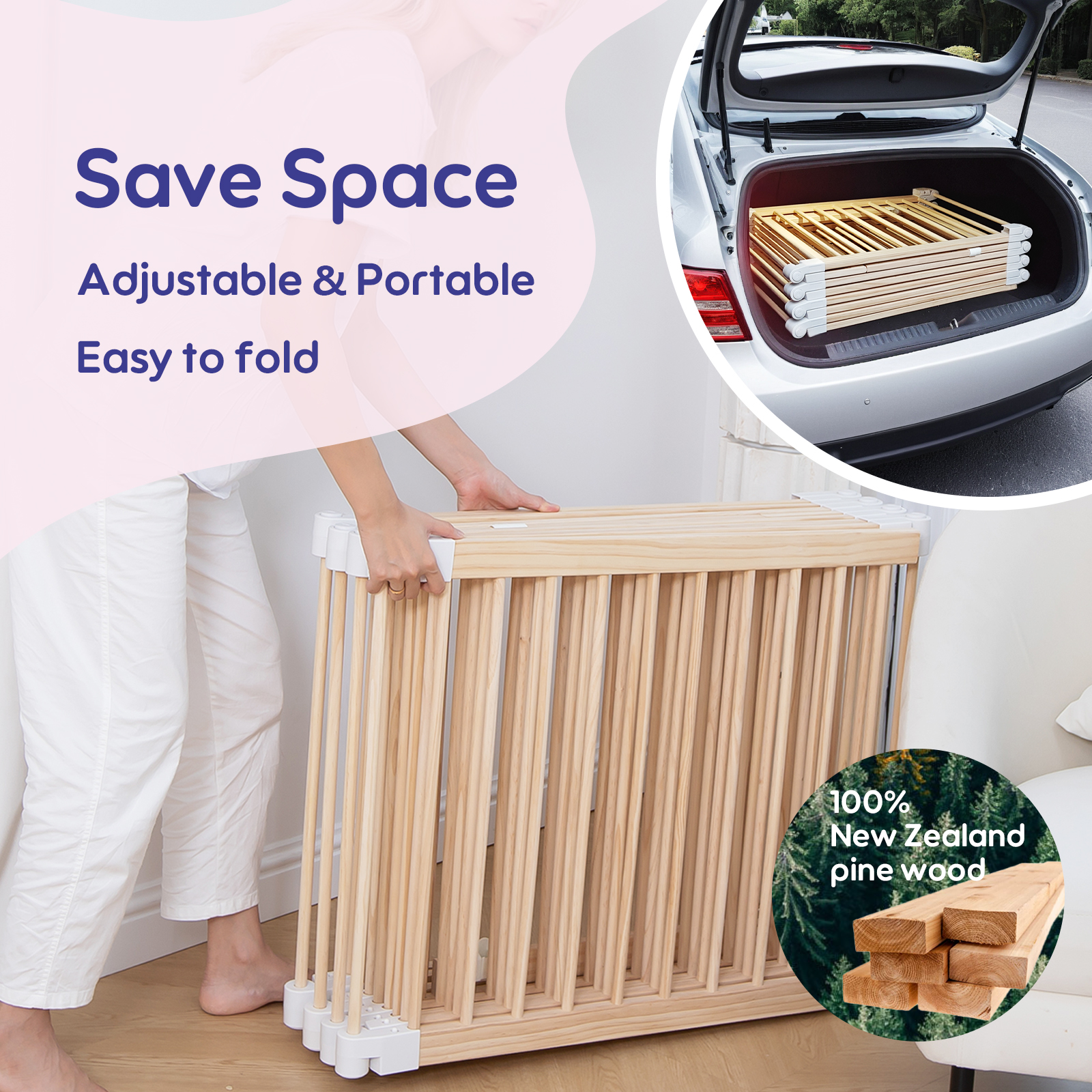 - HAND-SANDED & TODDLER SAFE: This babies play yard is made from New Zealand pine with a smooth feel, and it keeps away any spray paint, chemical. Meanwhile, it’s easy to install in minutes, compact size after folding. Even if the baby pulls on it, it’s hard to move with extra 16 suction cups