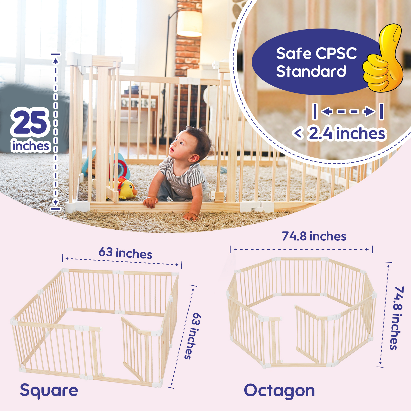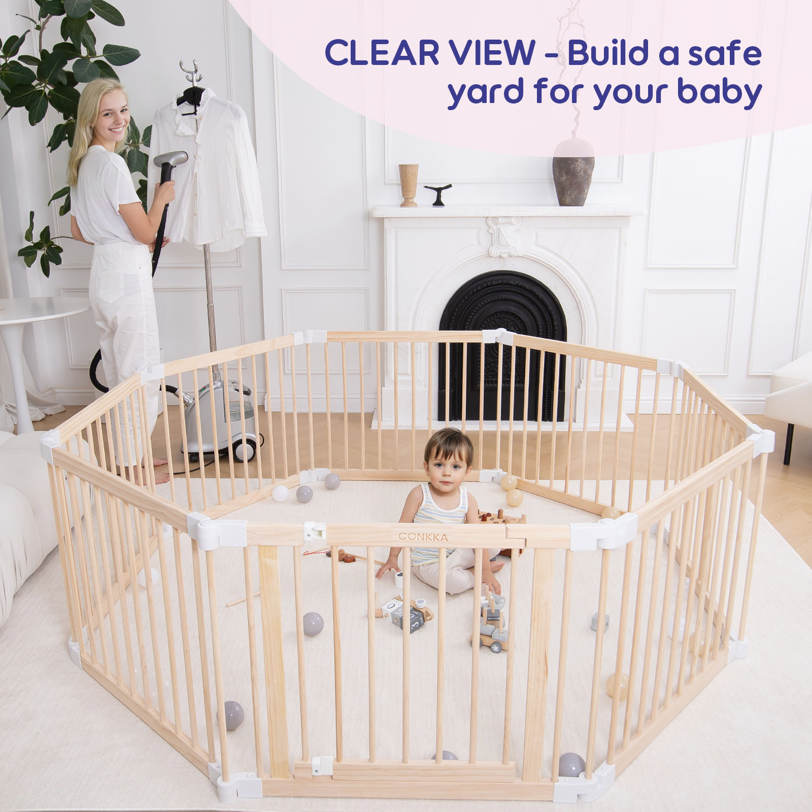 CONKKA Foldable Wooden Baby Playpen Large Play Yard for Babies and Toddlers, 2 in 1 Portable Fence Custom 25″ Tall Wood Gate with Adjustable Size & Shape for Infants 3-12 Months -63x63x25 inch